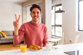 Zdjęcie "Młody człowiek rasy mieszanej jedząc śniadanie w kuchni rano dotykając tył głowy, myśląc i dokonując wyboru." może być wykorzystywane do celów osobistych i komercyjnych zgodnie z warunkami zakupionej licencji Royalty-free. Obraz jest dostępny do pobrania w jakości wysokiej rozdzielczości do 5760x3840.