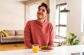 Młody człowiek rasy mieszanej jedząc śniadanie w kuchni rano dotykając tył głowy, myśląc i dokonując wyboru.
