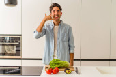 Zdjęcie "młody mieszane wyścig człowiek gospodarstwa pomidory w jego kuchnia" może być wykorzystywane do celów osobistych i komercyjnych zgodnie z warunkami zakupionej licencji Royalty-free. Obraz jest dostępny do pobrania w jakości wysokiej rozdzielczości do 5760x3840.