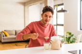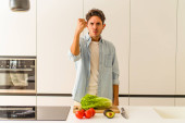 młody mieszane wyścig człowiek przygotowanie a sałatka dla obiad krzycząc bardzo zły i agresywny.