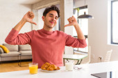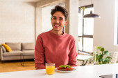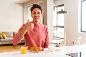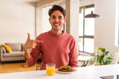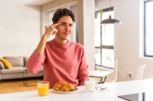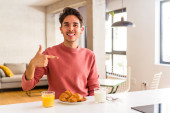 Młody człowiek rasy mieszanej je śniadanie w kuchni rano uśmiechając się i wskazując na bok, pokazując coś w pustej przestrzeni.