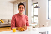 Zdjęcie "Młody człowiek rasy mieszanej je śniadanie w kuchni rano uśmiechając się i wskazując na bok, pokazując coś w pustej przestrzeni." może być wykorzystywane do celów osobistych i komercyjnych zgodnie z warunkami zakupionej licencji Royalty-free. Obraz jest dostępny do pobrania w jakości wysokiej rozdzielczości do 5760x3840.