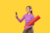 pełny widok długości zdumiony sportowiec w słuchawki wskazując na telefon komórkowy z ekranem bankowym na żółty