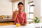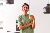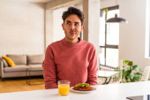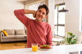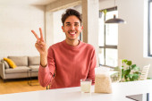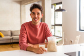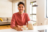 Zdjęcie "młody mieszane wyścig człowiek jedzenie owsianki i mleka na śniadanie w jego kuchni szczęśliwy, uśmiechnięty i wesoły." może być wykorzystywane do celów osobistych i komercyjnych zgodnie z warunkami zakupionej licencji Royalty-free. Obraz jest dostępny do pobrania w jakości wysokiej rozdzielczości do 5760x3840.