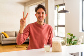 młody mieszane wyścig człowiek jedzenie owsianki i mleka na śniadanie w jego kuchni szczęśliwy, uśmiechnięty i wesoły.