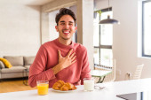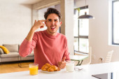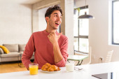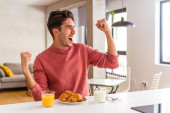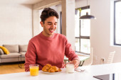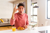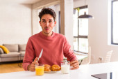 Młody człowiek rasy mieszanej jedząc śniadanie w kuchni na rano czuje się dumny i pewny siebie, przykład do naśladowania.