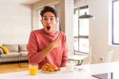 Zdjęcie "Młody człowiek rasy mieszanej jedząc śniadanie w kuchni na rano czuje się dumny i pewny siebie, przykład do naśladowania." może być wykorzystywane do celów osobistych i komercyjnych zgodnie z warunkami zakupionej licencji Royalty-free. Obraz jest dostępny do pobrania w jakości wysokiej rozdzielczości do 5760x3840.