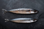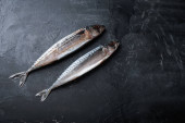 Surowa makrela na czarnym tle, widok z góry z przestrzenią do kopiowania.