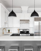 Zdjęcie "ELMHURST, IL, USA - CZERWCA 2, 2021: Luksusowa biała kuchnia z czarnymi lampkami wiszącymi nad granitową wyspą wodospadu, urządzeniami Bosch ze stali nierdzewnej oraz złotym okuciem i kranem." może być wykorzystywane do celów osobistych i komercyjnych zgodnie z warunkami zakupionej licencji Royalty-free. Obraz jest dostępny do pobrania w jakości wysokiej rozdzielczości do 5760x3840.