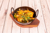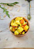 Pyszne Kurczak z warzywami i cebulkami w sosie tajskim na białej płytce z dekorowanym obręczy