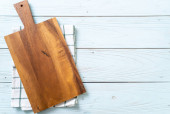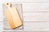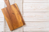 Drewniana deska do cięcia na szarym betonowym tle. Widok z góry z miejsca kopiowania.