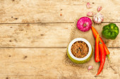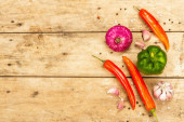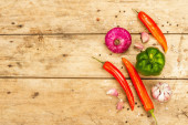 Gulasz wegański z zestawem świeżych warzyw. Posiekany gotowane składniki na drewnianym tle, widok z góry