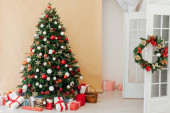 Przytulne mieszkanie pokój zielony Christmas Tree prezenty prezenty girlandy, świece urządzone zabawki wnętrza Nowy Rok piękny salon w godzinach wieczornych, światła świecące bokeh