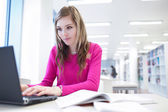 w bibliotece - ładne, kobiece studenta z laptopa i książki wo