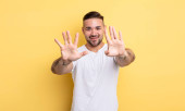 młody przystojny mężczyzna wygląda szczęśliwy, arogancki, dumny i zadowolony z siebie, czuje się jak numer jeden