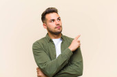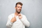 młody przystojny mężczyzna czuje obrzydzenie i mdłości, wycofuje się od czegoś paskudnego, śmierdzącego lub śmierdzącego, mówiąc fuj