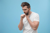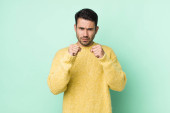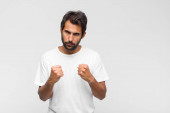 młody przystojny mężczyzna patrząc pewny siebie, zły, silny i agresywny, z pięściami gotowy do walki w pozycji bokserskiej