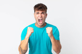 Zdjęcie "młody przystojny mężczyzna patrząc pewny siebie, zły, silny i agresywny, z pięściami gotowy do walki w pozycji bokserskiej" może być wykorzystywane do celów osobistych i komercyjnych zgodnie z warunkami zakupionej licencji Royalty-free. Obraz jest dostępny do pobrania w jakości wysokiej rozdzielczości do 5760x3840.