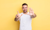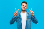 młody przystojny mężczyzna wygląda szczęśliwy, pewny siebie i godny zaufania, uśmiechnięty i pokazując znak zwycięstwa, z pozytywnym nastawieniem