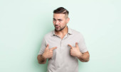 Zdjęcie "młody przystojny mężczyzna wygląda szczęśliwy, pewny siebie i godny zaufania, uśmiechnięty i pokazując znak zwycięstwa, z pozytywnym nastawieniem" może być wykorzystywane do celów osobistych i komercyjnych zgodnie z warunkami zakupionej licencji Royalty-free. Obraz jest dostępny do pobrania w jakości wysokiej rozdzielczości do 5760x3840.