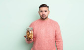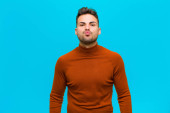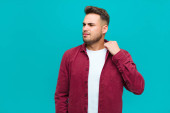 młody przystojniak wygląda poważnie i ciekawie, słucha, próbuje usłyszeć tajną rozmowę lub plotki, podsłuchuje