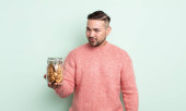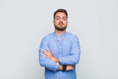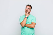 młody przystojniak czujący się troskliwy, zastanawiający się lub wyobrażający sobie pomysły, marzący na jawie i patrzący w górę, aby skopiować przestrzeń