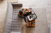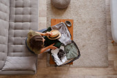 Gospodyni domowa ręce z starannie umieścić bieliznę, ubrania i akcesoria nowoczesnej organizacji garderoby
