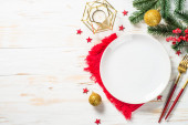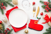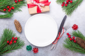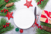 Nakrycie stołu świątecznego z dekoracjami wakacyjnymi i zaprogramowanym pudełkiem przy białym drewnianym stole.