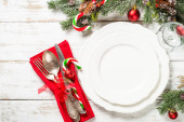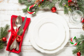 Zdjęcie "Nakrycie stołu świątecznego z dekoracjami wakacyjnymi i zaprogramowanym pudełkiem przy białym drewnianym stole." może być wykorzystywane do celów osobistych i komercyjnych zgodnie z warunkami zakupionej licencji Royalty-free. Obraz jest dostępny do pobrania w jakości wysokiej rozdzielczości do 5760x3840.