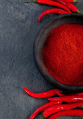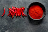 Czerwone chili lub papryka cayenne chilli znaleźć pieprz na ciemnym tle. Tradycyjna koncepcja przypraw. Widok z góry, płaski, przestrzeń do kopiowania