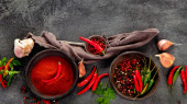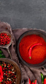 Zdjęcie "Pikantny sos pomidorowy chili na szarym tle. Tradycyjna koncepcja ostrego sosu. " może być wykorzystywane do celów osobistych i komercyjnych zgodnie z warunkami zakupionej licencji Royalty-free. Obraz jest dostępny do pobrania w jakości wysokiej rozdzielczości do 5760x3840.
