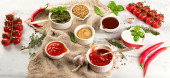 Pikantny sos pomidorowy chili na szarym tle. Tradycyjna koncepcja ostrego sosu.