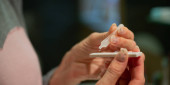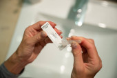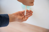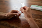 Widok z bliska na ręce samic trzymających probówkę z roztworem testowym19 zestaw do samodzielnego testowania w konceptualnym obrazie pandemii koronawirusa.