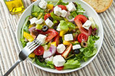 Miseczka sałatki greckiej serwowane w serwetkę na drewniane tło zbliżenie