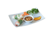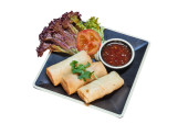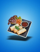 Widok nad głową na sajgonki z pikantnym sosem odizolowany na białym ze ścieżką wycinania