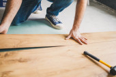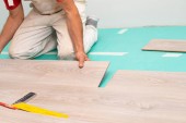 Zdjęcie "Facet kładzie laminat kwarcowy na podłodze. Naprawa lokalu. Podłogi współczesne." może być wykorzystywane do celów osobistych i komercyjnych zgodnie z warunkami zakupionej licencji Royalty-free. Obraz jest dostępny do pobrania w jakości wysokiej rozdzielczości do 5760x3840.