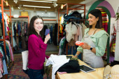 Zdjęcie "Atrakcyjna młoda kobieta i jej przyjaciółka przymierzają piękne kolczyki w lumpeksie " może być wykorzystywane do celów osobistych i komercyjnych zgodnie z warunkami zakupionej licencji Royalty-free. Obraz jest dostępny do pobrania w jakości wysokiej rozdzielczości do 5760x3840.