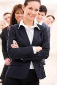 portret charyzmatycznej kobiety na spotkaniu podczas jej zespołu pracującego