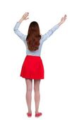 Widok piękna kobieta w sukience patrząc na ścianie i posiada z tyłu