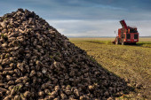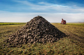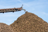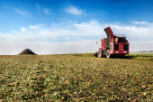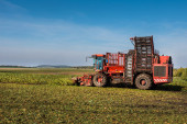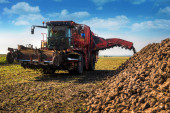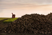 Maszyna do zbioru buraków cukrowych na polu wylewa stosy, zachmurzone błękitne niebo w jesienny dzień