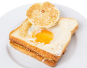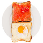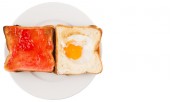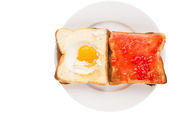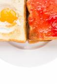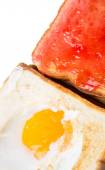 chleba, tosty z dżemem truskawkowym i jajkiem