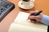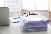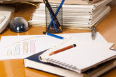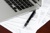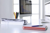 miejsce pracy laptopa, długopis, notatnik na stole