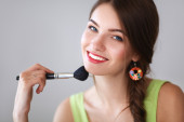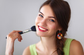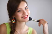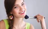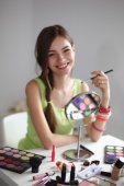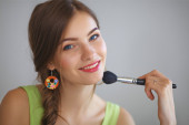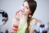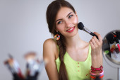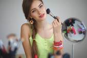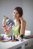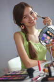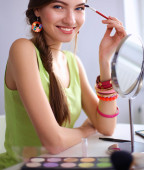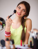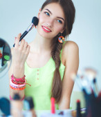 Młoda piękna kobieta robi makijaż w pobliżu lustra