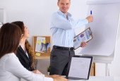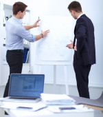 Biznesmeni siedzą i dyskutują na spotkaniu biznesowym