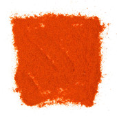 Czerwony proszek pieprzowy umieszczony na białym tle. Pieprz cayenne, papryka w proszku. Widok bezpośrednio z góry.