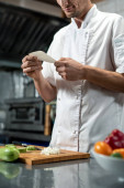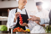 Przycięty widok szefa kuchni cięcia porów w pobliżu kolegi z kapustą w kuchni