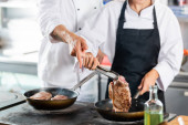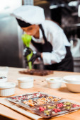 Widok na wytatuowanego szefa kuchni trzymającego nóż i por w plasterkach w kuchni
