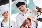 Azji szef gospodarstwa surowe mięso w pobliżu uśmiechniętych kolegów z książki kucharskiej w kuchni