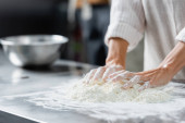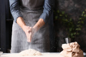 Widok przycięte kucharz wylewanie żółtka jaj na mąkę w kuchni, sztandar
