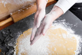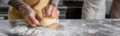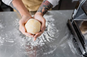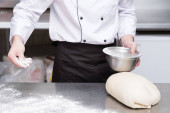 Przycięty widok dojrzałego szefa kuchni w fartuchu podejmowania ciasta na stole kuchennym
